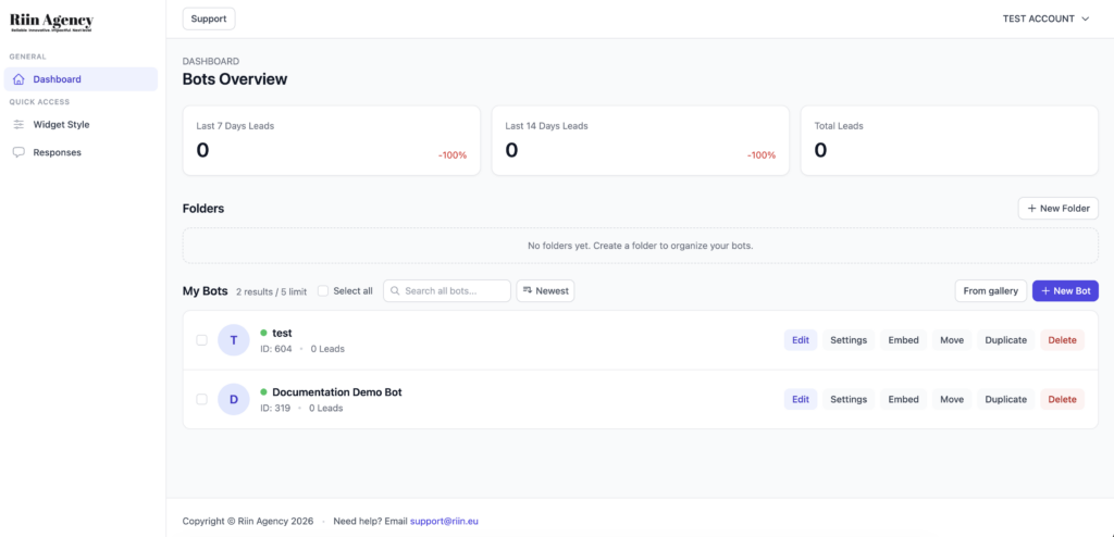 - Use folders if you have multiple bots for different websites or clients.