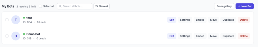- Duplicate – copy an existing bot.